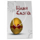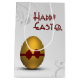 An elegant and modern Easter illustration featuring a golden Easter egg with a red bow with decorated floral swirl pattern illustration in professional classic white and grey colour shades.