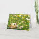 Happy Easter greeting card with golden Easter eggs basket in a green grass full of beautiful yellow dandelions and white daisies.