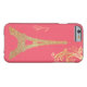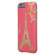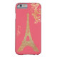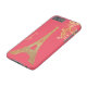 Glam iPhone 6 case, with a glitzy looking gold tone glitter looking silhouette of the Eiffel Tower, against a coral pink background. Personalise the yellow gold text, for yourself or as a great gift idea.