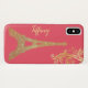 Glam iPhone X case, with a glitzy looking gold tone glitter looking silhouette of the Eiffel Tower, against a coral pink background. Personalise the yellow gold text, for yourself or as a great gift idea.