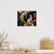 This exquisite poster showcases a mesmerising Art Deco-inspired design featuring a graceful feline perched on a golden crescent moon. Intricate gold filigree details intertwine with marble-like textures and rich red accents, creating a luxurious and timeless aesthetic. The black background highlights the cat's elegant curves and the delicate interplay of gold and white, making this artwork a captivating centerpiece for any space. Perfect for lovers of cats, celestial themes, and sophisticated decor, this poster is a statement of elegance and charm.