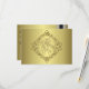 A gold wedding RSVP announcement featuring an engraved-look decoration of wedding bells and ribbons inside an ornate frame, with a black velvet look ribbon edged in white lace. These elegant wedding announcements are part of a matching wedding stationery pack which also includes matching gold invitation announcements, wedding postage stamps, address labels and matching golden envelope seals. If you require an item which isn't already offered here, please don't hesitate to contact me for more custom wedding stationery work. You can reach me by clicking on the Contact link directly above.