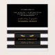 Coordinates with the Golden Eyelashes with Black and White Stripes Business Card Template by 1201AM. A bold striped black and white background creates visual interest on this customisable lash extensions salon aftercare card. © 1201AM CREATIVE
