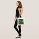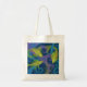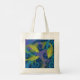 Tote bag featuring colorful painting, three golden yellow fish in blue water, violet, turquoise and yellow seagrass and bubbles.