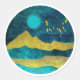 Abstract mountain landscape design in bold shades of gold, cyan,and blue with a moonrise, stars, and birds.