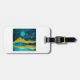 Abstract mountain landscape design in bold shades of gold, cyan,and blue with a moonrise, stars, and birds.