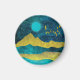 Abstract mountain landscape design in bold shades of gold, cyan,and blue with a moonrise, stars, and birds.