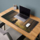 A cinematic desk mat featuring a lone rider traveling through a misty forest illuminated by warm golden sunlight. This atmospheric nature design adds adventure, depth, and calm woodland energy to any workspace.