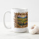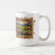 This coffee mug has a golden frame which contains a landscape painting.