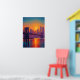 Colorful pointillist painting of San Francisco featuring the Golden Gate Bridge glowing above the bay at sunset. Thousands of vibrant dots create a luminous neo-impressionist cityscape with shimmering water reflections and a radiant skyline atmosphere.