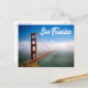 Welcome to San Francisco! This fun California travel post card features an aerial view of the infamous Golden Gate Bridge located in the San Francisco bay on a foggy early morning.