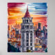 A captivating blend of watercolor, acrylic, and oil paints brings to life the iconic Coit Tower in a vibrant San Francisco sunset. The painting masterfully combines precise line art with rich, textured brushstrokes, creating a dynamic and visually stunning composition.