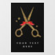 Change the text easily! Golden glitter scissors classic black colour combination. Elegant hair stylist sign with a red ribbon (photo element).