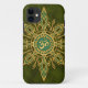 An Aum or Om symbol sits inside of a elaborate sun design. The star is made up of eight stylised rays that stretch out like spokes from a circle in the centre. The intricate lines and dots are coloured with a golden yellow that is highlighted to give the pattern a light shine on the surface. A shadow falls onto the deep green background making the design appear to float just above the surface of this iphone3 case. This stylish design is a striking representation of this spiritual symbol.