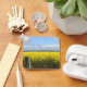 A field of bright yellow flowers stretches out under a partly cloudy sky, with mountains visible in the distance. A wooden fence in the foreground adds a rustic touch to the landscape. This image was taken near Ararat in Victoria, Australia.