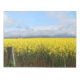 A field of bright yellow flowers stretches out under a partly cloudy sky, with mountains visible in the distance. A wooden fence in the foreground adds a rustic touch to the landscape. This image was taken near Ararat in Victoria, Australia.