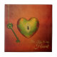 Lovely and romantic illustration featuring a golden heart and key on a structured red background. Gold Script love quote: "The key to my heart".