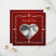 Personalised Save the Date announcement with golden hearts on dark red background.