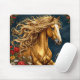 Enchanting image of a golden horse with flowing mane adorned by pastel flowers, evoking beauty and elegance. Shows detail and charm, appealing to nature and equine enthusiasts.