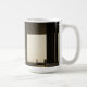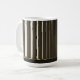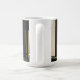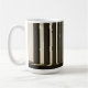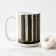 Modern architectural colonnade with tall vertical columns casting long diagonal shadows at golden hour; lone figure in distance—minimalist wraparound mug.