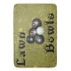 Pictured on gold are four black lawn bowls with a jack and a decorative lawn bowls text