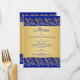 Golden leafy swirls and joined hearts on a royal blue background Wedding Menu Card.