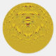 This artwork features a large, stylised lion head motif that dominates the composition. The design is highly symmetrical and intricate, resembling a mandala or heraldic crest. The lion's features are abstract and geometric, formed by repeating patterns and swirling lines, creating a modern and artistic interpretation. The background is a solid, flat yellow, emphasizing the golden lion head and enhancing its visual impact.