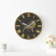 Dramatic and elegant clock design features center gold lion etching with roman numeral clock face on black background
