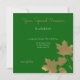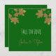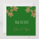 Square invitation card with golden maple leaves in an emerald background. It comes with text, " Fall in Love." Stylish invitations or announcements for your wedding in autumn or fall Both sides to be customised! Template design by Alma Wad