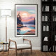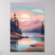 A radiant sun rises over softly blushed mountains, casting warm light across a quiet forest lake and grassy meadows. This dreamy artwork blends bright pastel skies with deep forest hues, making it a perfect addition to a calming, nature-inspired space.