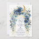 A luxurious celestial-themed wedding design featuring a midnight blue floral garden, shimmering gold accents, and a golden crescent moon framed by an ornate arch. Perfect for couples seeking a romantic, mystical, and starry-night-inspired celebration with elegant cosmic details.