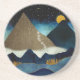 An abstract landscape with unique colours and textures showing a nigh time mountain scene with the glowing lights of climbers and a moon in shades of blue, gold, cyan, and yellow.