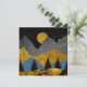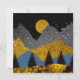 Abstract mountain landscape design in bold shades of gold, black, and blue with a moonrise and birds.