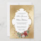 Create an unforgettable winter wedding with this elegant holiday invitation design featuring a lush spray of Christmas roses, poinsettia, holly and pine, white label with an ornate gold border and an opulent faux metallic gold gradient damask pattern background. Includes a custom gold crest with initial text fields.