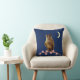 Fashion golden owl, pink flowers and crescent moon on navy blue throw pillow. The golden owl is standing on a blooming tree branch.