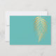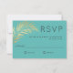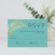 A wedding RSVP card In beautiful elegant minimalist style featuring a single golden faux foil palm frond over a Caribbean blue background. A contemporary style sans serif type face is used to compliment the contemporary style of the design. This response card is a wonderful choice for beach weddings, destination weddings or weddings with a tropical theme.