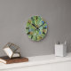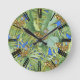 Golden Peacock Leaves on Cerulean Blue Round Clock