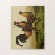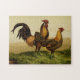 This vintage poultry design brings a touch of French farmhouse country chic to your puzzle table. These two golden penciled hamburgs - or hamburghs - look over a barnyard scene with late afternoon light. The combs and tail feathers show off beautiful plumage. This would also be a great touch for a chef's kitchen or a gift to a cook. This vintage artwork is public domain work from the 1921 Book of poultry, and is made available via the Biodiversity Heritage Library on the Flickr Commons.