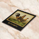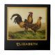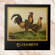 This heritage rooster poultry decorative tile brings a touch of French farmhouse country chic to your decor and gift-giving. Your or your recipient's name, initials, or other text appears below the rooster image, so make sure to type the text you want in the Personalise box. These two golden penciled hamburgs - or hamburghs - look over a barnyard scene with late afternoon light. The combs and tail feathers show off beautiful plumage. This would make a great addition to a study or office, as well as a Chrstmas gift The design is surrounded by a golden bronze border on a black backgroun. This vintage artwork is public domain work from the 1921 Book of poultry, and is made available via the Biodiversity Heritage Library on the Flickr Commons.
