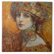 This beautiful ceramic tile features an artwork inspired by Gustav Klimt's "golden phase," depicting a woman from the Edwardian era. During this period, Klimt was fascinated with Byzantine mosaics and developed his mosaic technique using gold leaf and vibrant colours. This artwork pays tribute to Klimt's innovative mosaic approach and captures his style's abundant beauty. Add a touch of elegance to your home decor with this stunning tile.