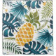 A large golden pineapple on a blue and green coloured palm tree leaves foliage pattern. White background.