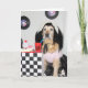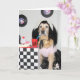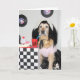 This card features a golden retriever dressed as a 50's girl in a poodle skirt drinking a milkshake at the malt shop. The text reads, "Hope your birthday rocks around the clock!".
