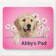 Cute golden retriever with white daisies on pink and white polka dot pattern.