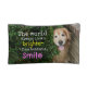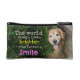 This bag features a photograph of a smiling golden retriever dog who is peering out from behind a green bush. The quote reads: "The world always looks brighter from behind a smile."