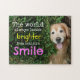 This puzzle features a photograph of a smiling golden retriever dog who is peering out from behind a green bush. The quote reads: "The world always looks brighter from behind a smile."