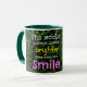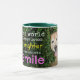 This coffee mug features a photograph of a smiling golden retriever dog who is peering out from behind a green bush. The quote reads: "The world always looks brighter from behind a smile."