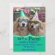 It's a party! This birthday invitation features two smiling golden retriever dogs who are wearing hats and sunglasses. Text is fully customisable with your own information.