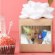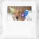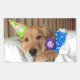 Ever been tired after a long day celebrating your birthday? This design features a photograph of a cute golden retriever dog tucked into bed, while wearing pyjamas and a party hat and holding his teddy bear. Time for sleep!