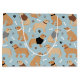 Cute Golden Retriever dogs with dark and light coats sit and stand with scattered dog bones and pawprints on a blue background.