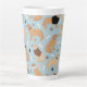 Cute Golden Retriever dogs with dark and light coats sit and stand with scattered dog bones and pawprints on a blue background.